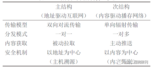 内容与地址双驱动网络能继续维持地址驱动互联网的主体地位并包容其演进,这样做既可以充分发挥互联网对于端到端对流交互型应用至今仍难以替代的优势,也可以最大程度地兼容现有互联网生态。并行不悖引入的内容驱动播存次结构,可以利用卫星等广播传输方式应对无尺度特征的挑战,通过辐射传输保证内容及其UCL标识一次分发、不限规模用户接收,实现内容在空间上的无限量复制,并通过在内容接收环节引入泛在存储,使广播内容的发送与接收解耦;同时,由于采用统一内容驱动基元UCL,有助于将治理模量化、碎片化、无序化内容大数据的难题,转化为治理结构化和标准化的富语义UCL标识,进而辅助甄别内容和解决内容安全问题。内容与地址双驱动网络中主结构和次结构的特征对比如表1所示。