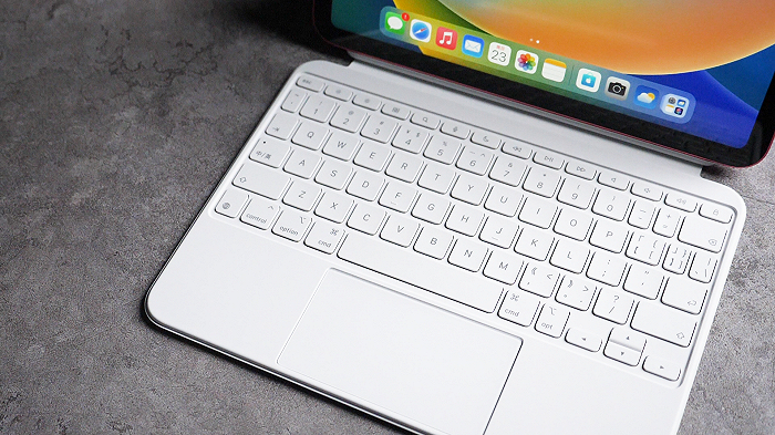 键盘整体为淡白色,相比iPad 10的靓丽配色更加温润,表面则为类肤质的手感。
