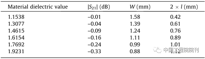 用于人工电介质设计的热塑性聚乳酸(PLA)的介电常数(ɛr)为2.72,PLA是一种非常常用的3D打印材料。该方法通过在COTS材料中插入空隙来修改介电常数,如表1所示。为了说明透镜的设计,选择一个周期为2 mm × 2 mm且由空隙和电介质组成的单元,如图4所示。所设计的单元及其所需的尺寸如表1所示。设计的单元有低于0.4 dB的插入损耗。