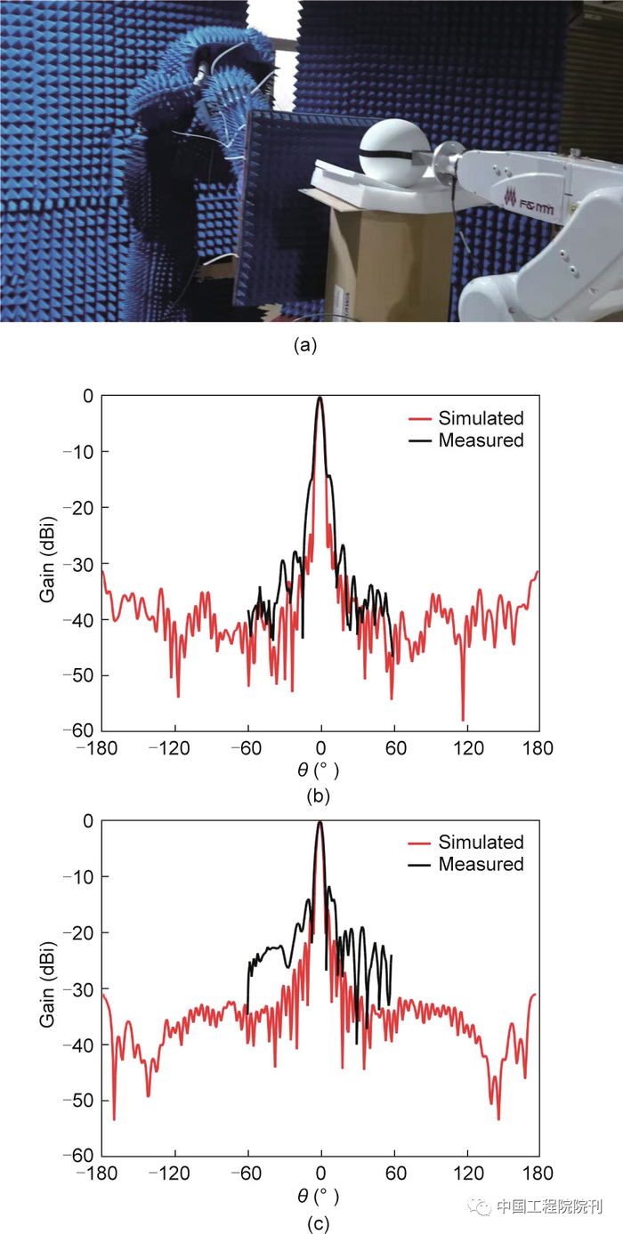 图6. 直径为14.5 cm的6层龙勃透镜天线的测量设置和方向图。(a)测量设置;(b)φ = 0°平面;(c)φ = 90°平面。