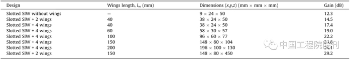 接下来将研究如何提高前一节中提出的CSIW扫描阵列的增益。如图19所示,在上述阵列配置的两侧增加两个金属机翼。目标是增加阵列在横切平面上的有效口径,从而缩小该平面上的波束,同时增加阵列的增益。图20展示了阵列的几何形状,其中在阵列的两端分别增加了两个机翼,以进一步提高性能。表2提供了带翼阵列设计的相关尺寸,以及该阵列实现的增益增强的结果。
