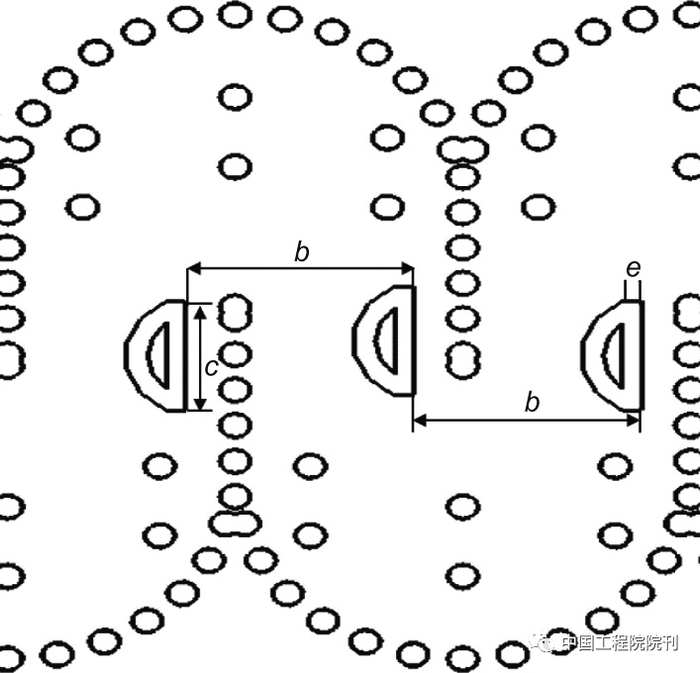 图14. 辐射元件的形状。b = 6 mm;c = 2.88 mm;e = 0.5 mm。b:两个连续槽之间的间隔距离;c:槽长度;e:槽宽度。
