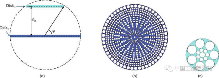图13. 替代透镜设计。(a)不同圆盘的位置。hn:第n个圆盘高度;n:圆盘数;Diskn:第n个圆盘。(b)透镜中心附近的圆盘平面。(c)透镜最末端的圆盘。
