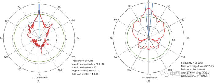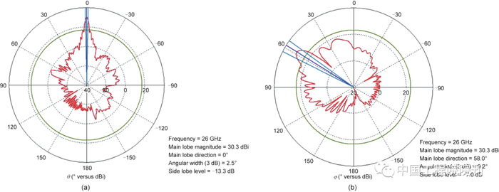 图27. 改进的凹槽SWAA在26 GHz下的方向图。(a)H平面;(b)E平面。这里E平面和H平面是线性极化天线的参考平面。
