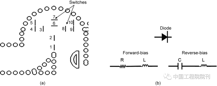 图16. 本文提出的开槽SIW弯曲阵列。(a)一个包含所有开关的SIW弯曲部分;(b)一个PIN二极管。R:电阻,L:电感;C:电容。