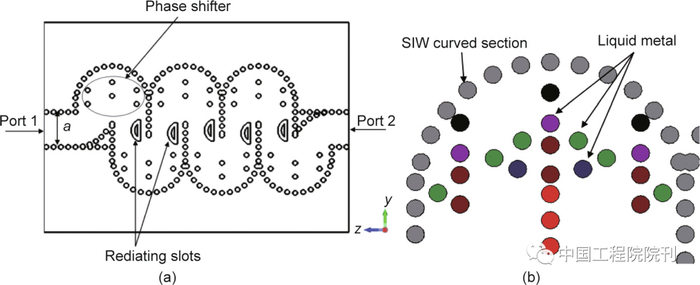 图15. 本文提出的开槽SIW弯曲阵列。(a)一个移相器示例;(b)一个SIW弯曲部分,有色开关表示根据所需的相移“打开”或“关闭”。
