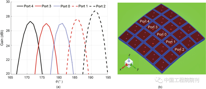 图11. φ = 90°时的2D仿真方向图。(a)对不同有源馈电元件的增益响应;(b)不同有源馈电元件的位置。