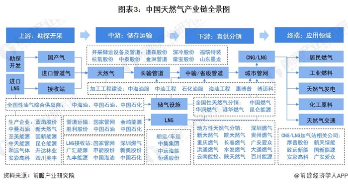 天然气产业链分为三个部分:上游勘探生产、中游运输以及下游分销,产业链较为完整,参与公司众多,发展格局较为稳定。上游天然气勘探生产相关资源集中于中石油、中石化和中海油等综合油气公司,其他油气相关公司包括国新能源、蓝焰股份、中天能源等。