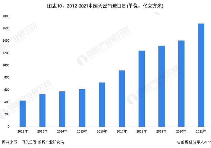 由于我国对于天然气能源的巨大需求量,我国天然气行业进出口基本呈现出“全进口、零出口”的格局。2021年,中国宏观经济实现“十四五”良好开局,全国天然气消费量3690亿立方米,增量410亿立方米,同比增长12.5%。