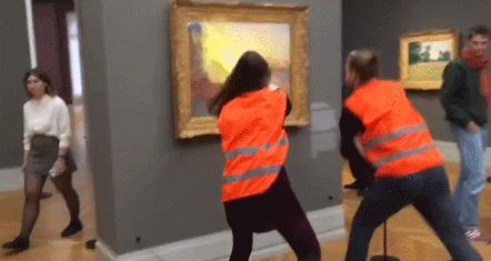 据报道,一名活动人士喊道:“难道要在一幅画上涂上土豆泥才能让你听进去吗?”“如果我们不得不为食物而战斗,这幅画将一文不值。”