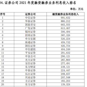 根据证券业协会公布的数据,中信证券、华泰证券、国泰君安、广发证券、银河证券、招商证券、申万宏源等2021年融资融券业务利息收入均在50亿元以上,排名前20的券商2021年融资融券业务利息均在10亿元以上水平。
