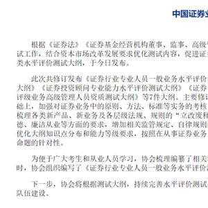 中证协表示,为做好新形势下证券行业专业人员水平评价测试工作,结合资本市场改革发展要求优化测试内容,促进证券从业人员提升职业道德和专业能力,协会主要从四方面对测试大纲做出修订,整体来看修订后更加强调业务实操、专业技能,更注重合规、执业道德和廉洁从业,大纲中涉及的相关政策规则也同步更新。