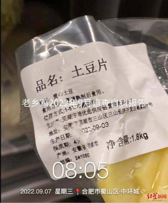 ↑2022年9月自查自纠报告:土豆片过期。图据老乡鸡微信推文