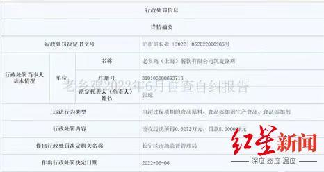 2022年4月,老乡鸡上海凯旋路店因使用过期鸡油,被长宁区市场监管局处罚。此事也被列入6月的自查自纠报告。