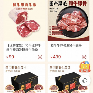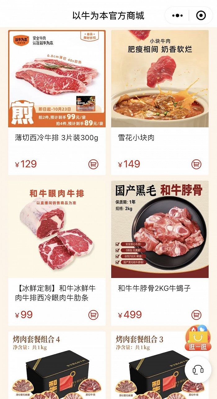 就产品而言,目前以牛为本通过小程序商城上架售卖9款产品,包括牛排、小块肉、牛蝎子、烤肉礼盒等,价格区间为99-499元。其中销量最好的一款产品为“和牛A1牛排”组合,包含1块200g的眼肉牛排、3块200g的西冷牛排,以及一块200g的上脑牛排,售价499元。不过或许出于上线时间较短,销量最高的产品目前仅卖出128份。