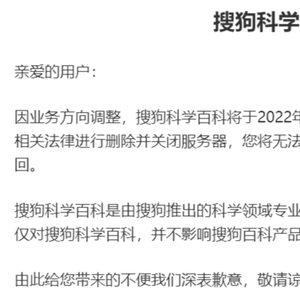 不过,此后关于搜狗科学百科的动态并不多。再度引发大规模的关注即是此次其发布的服务暂停公告。该则公告还指出,搜狗科学百科与搜狗百科为两个独立产品,本次停止服务与运营仅对搜狗科学百科,并不影响搜狗百科产品正常使用。