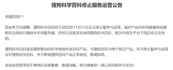 日前,搜狗科学百科发布停止服务运营公告称,因业务方向调整,搜狗科学百科将于2022年11月11日正式停止服务与运营。届时产品内所有数据将依据相关法律进行删除并关闭服务器,用户将无法登录及使用搜狗科学百科,相关内容在平台下线后将无法找回。