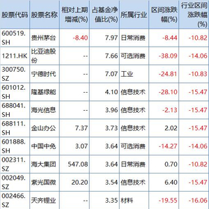 紫金矿业(601899.SH)、五粮液(000858.SZ)、山西汾酒(600809.SH)、三一重工(600031.SH)、分众传媒(002027.SZ)、东方雨虹(002271.SZ)、比亚迪(002594.SZ)退出前十。