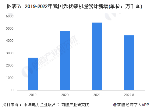 得益于多项利好政策扶持和光伏发电平价上网的实现,我国逐渐成为全球最重要的光伏产业生产及应用市场之一。近年来,我国光伏装机量累计新增呈现稳步上升的趋势。据中国电力企业联合会数据统计,2021年我国光伏装机量累计新增5493万千瓦;截至8月,2022年我国光伏装机量累计新增4447万千瓦。