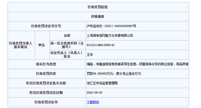 中国质量新闻网讯(闫冬)上海市市场监督管理局网站近日公布的一则行政处罚决定书显示,因直播带货时有编造信息贬低损害竞争对手商业信誉等行为,上海清争落网鱼文化传媒有限公司(以下简称当事人)因违反《中华人民共和国反不正当竞争法》被市场监管部门罚款98万元。