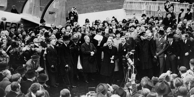 1938年,德国无视《凡尔赛和约》的规定,武装吞并了奥地利。此时,安东尼·艾登和温斯顿·丘吉尔等人极力呼吁对纳粹德国采取行动,遏制希特勒的扩张行为,但张伯伦始终不为所动。1938年9月,希特勒扬言要对捷克斯洛伐克采取军事行动,德国军队开始大规模地向边境集结,欧洲战争大有一触即发之势。张伯伦9月中旬赶赴德国会见希特勒。尽管希特勒对张伯伦给予了冷遇并以开战相威胁,张伯伦仍对其抱有幻想,祈求对方不要采取战争手段。最终,张伯伦错误地认为对苏台德地区的领土诉求就是希特勒的最终要求,只要答应这一点就能够避免将欧洲拖入战争。在张伯伦的极力斡旋下,德国、英国、法国和意大利于1938年9月29日至30日,签署了《慕尼黑协定》,同意了希特勒的要求,将苏台德地区并入德国。30日,张伯伦又与希特勒继续会谈,签署《英德宣言》,宣布两国“彼此将永不作战”,“决心以协商办法”解决一切争端。张伯伦对此十分满意,回到伦敦即在机场发表演讲,得意忘形地对欢迎的人们挥着那张有希特勒签字的宣言,宣称自己为英国带回了“整整—代人的和平保障”。