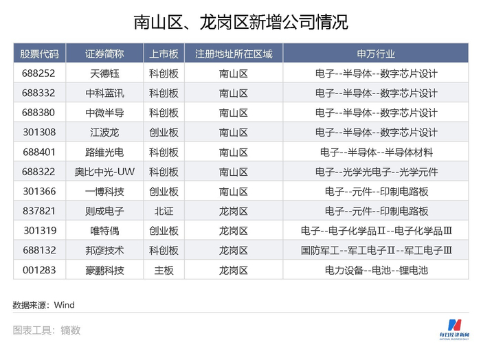 情理之中,意料之外的是,天德钰(SH688252,股价20.20元,市值81.92亿元)、中科蓝讯(SH688332,股价47.30元,市值56.76亿元)、中微半导(SH688380,股价28.93元,市值115.83亿元)、江波龙(SZ301308,股价60.59元,市值250.15亿元),4家注册地址都在南山区的公司,均从事“数字芯片设计”。