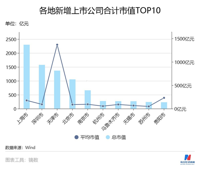 一般来说,新增上市公司数量多的地方,企业总市值之和也较高,但天津是个例外。今年,天津虽然仅新增一家上市公司——海光信息(SH688041,股价38.89元,市值903.94亿元 *注),但也正是凭借这个大块头,天津以1367.18亿元总市值位列新增总市值第三位。