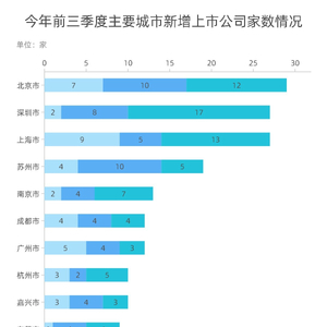 今年前三季度,A股上市公司新增数量超过10家的城市就有7座,并由此形成了3个梯队。除了北京、上海、广州、深圳这四座一线城市外,苏州、南京、成都也位列其中。