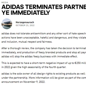 10月25日,阿迪达斯放弃了侃爷。阿迪达斯官网发文称,该公司“不容忍反犹太主义和任何其他形式的仇恨言论”,“Ye最近的言论和行为是不可接受的、充满仇恨和危险,这些言行违反了公司的多样性、包容性、相互尊重和公平的价值观”。