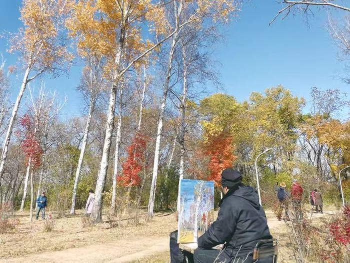 在一棵茂盛的白桦树前,长春市第一中等专业学校的美术老师吴健东正在聚精会神地创作油画。吴健东说,和热情火红的枫叶比起来,他更偏爱清新素雅的白桦。“不同于夏日的翠绿,秋季的白桦树有着不同的色彩和层次感,在这里呼吸着清新的空气,将美景搬运到画纸上,对我来说也是一种享受。”吴建东说,今年,他已经在白桦林画了30多幅油画了,对这里的一草一木都非常熟悉,能看到这里的美景跃然纸上,他觉得很有成就感。“这里别有意境。”市民赵女士对白桦树有着一份特别的情愫,在她看来,白桦林的素雅别有一份浪漫的味道,所以,她特意带着老公来白桦林游玩。“他负责拍照,我负责发朋友圈。”赵女士幸福地说。