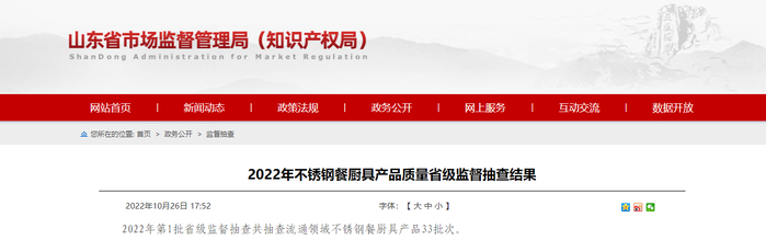 中国质量新闻网讯 据山东省市场监管局网站10月26日消息,2022年第1批省级监督抽查共抽查流通领域不锈钢餐厨具产品33批次。