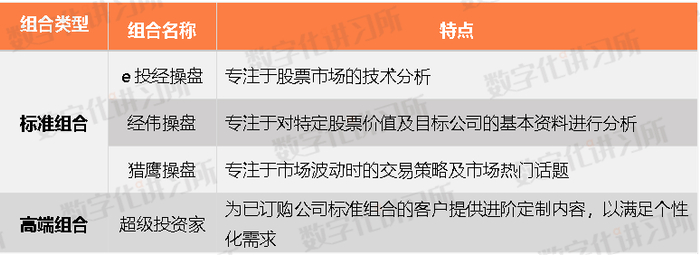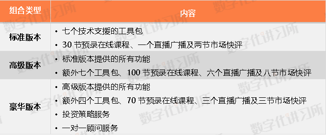 针对不同的投资需求,九方智投要提供三个系列标准组合,各系列的客户均可浏览不同组合的预录课程、直播及市场快评。对于已订阅标准组合的客户,亦可选择进一步订阅优质服务(高端组合),例如一对一顾问服务及投资策略服务。