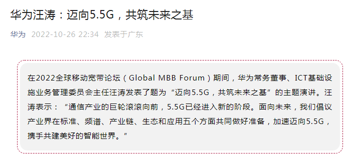 据华为官方微信号10月26日晚间消息,在2022全球移动宽带论坛(Global MBB Forum)期间,华为常务董事、ICT基础设施业务管理委员会主任汪涛发表了题为“迈向5.5G,共筑未来之基”的主题演讲。汪涛表示:“通信产业的巨轮滚滚向前,5.5G已经进入新的阶段。