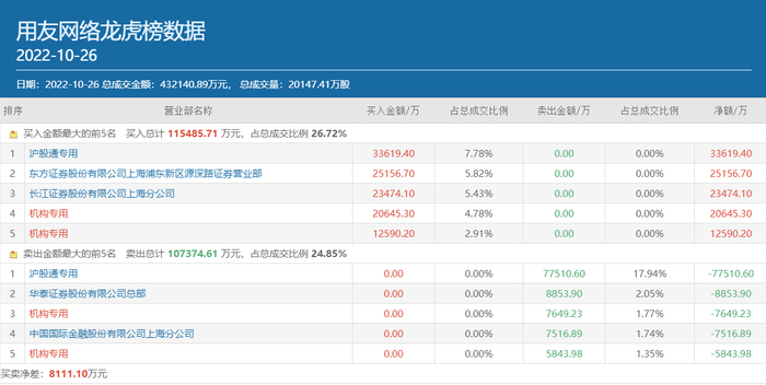 北上资金和机构资金也积极参与了用友网络的博弈,其中沪股通专用席位同时高居该股买卖双方榜首,买入金额为3.36亿元,卖出金额为7.75亿元;有两个机构专用席位分列该股买方第四和第五位,合计买入3.32亿元,同时有两个机构专用席位分别居于其卖方第三和第五位,合计卖出1.35亿元。