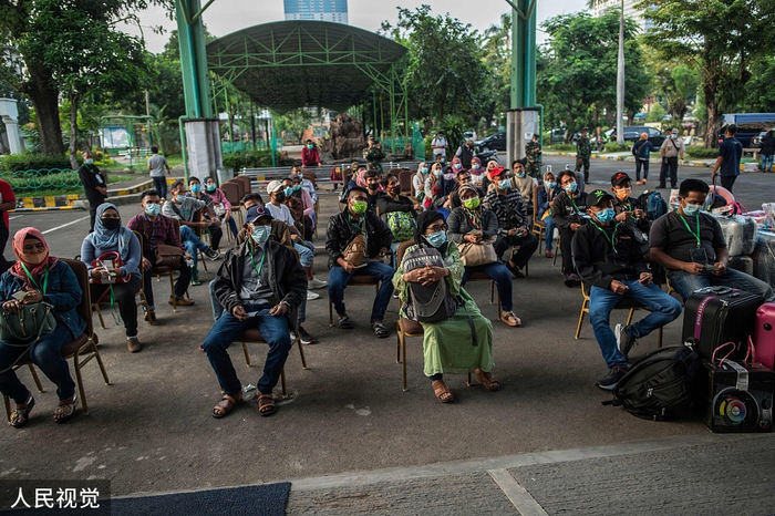 当地时间2021年4月28日,印度尼西亚泗水,卫生官员对从马来西亚和新加坡返回的移民工人进行新冠病毒筛查,然后对他们进行隔离。人民视觉 资料图