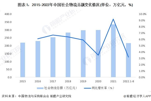 2022年1-8月,社会物流总额216.4万亿元,按可比价格计算,同比增长3.2%。