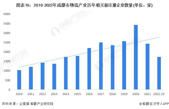 根据企查猫查询数据,近年来成都市物流产业历年新注册企业数量也快速增长。截至2022年10月17日,成都物流产业相关的注册企业超1730家,其中2020年新注册企业数量创历史高峰,2020年全年成都物流产业注册企业数量为3428家,较2019年增加864家,成都物流产业的发展热潮未减。