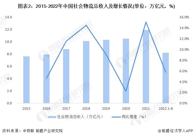 中物联数据显示,2015-2021年,我国物流业总收入整体呈逐年递增趋势。2021年我国物流体系建设稳步推进,适应市场物流需求变化,物流供给服务保持快速增长,支撑产业链、供应链韧性提升。全年物流业总收入11.9万亿元,同比增长15.1%。2022年1-8月,全国社会物流总收入为8.2万亿元,按可比价格计算,同比增长5.8%。