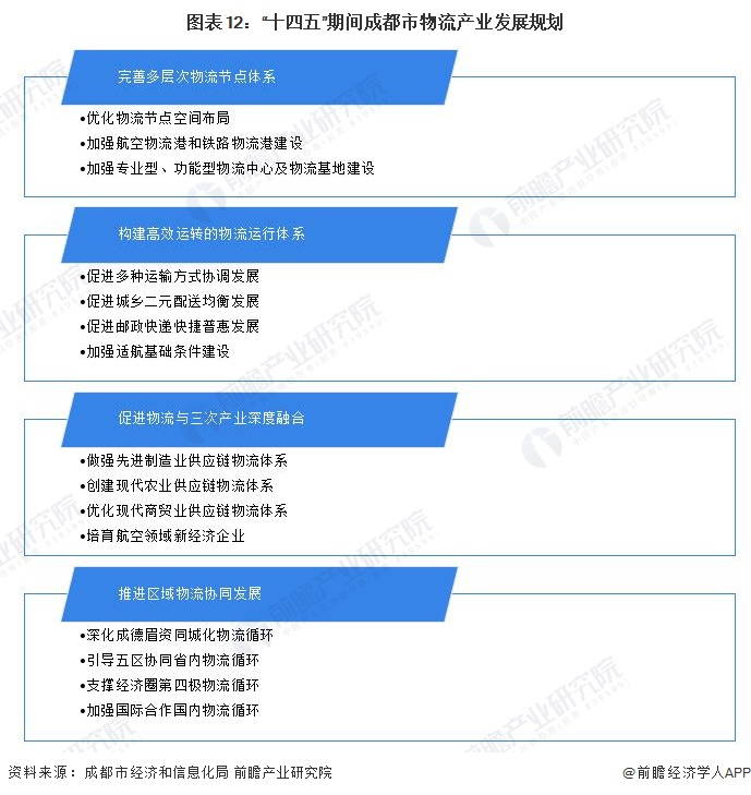 “十四五”期间,成都市将从完善多层次物流节点体系、构建高效运转的物流运行体系、促进物流与三次产业深度融合和推进区域物流协同发展“四项重点任务”发展物流产业: