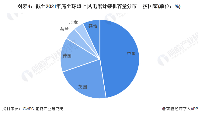 截至2021年,全球海上风电累计装机容量为57.2GW。其中,中国占比47%,全球排名第一;其次为英国,占比为22%;德国、荷兰和丹麦分别位列第三到第五,占比分别为14%、5%和4%。