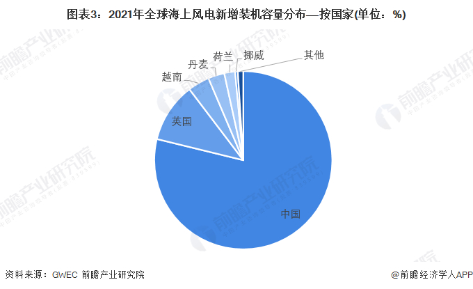 2021年,全球新增海上风电装机量主要集中在中国、英国、越南、丹麦和荷兰五国,这五国新增海上风电装机量占到了全球新增海上风电装机量的99%,其中中国占比最大,达到80%。