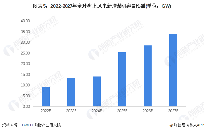 在经历2021年中国市场政策驱动下的“抢装潮”后,全球海上风电市场将恢复冷静,但仍将保持高速增长。据GWEC预测,2027年全球海上风电新增装机容量将达到33.95GW,2022-2027年年均复合增长率约为32.96%。