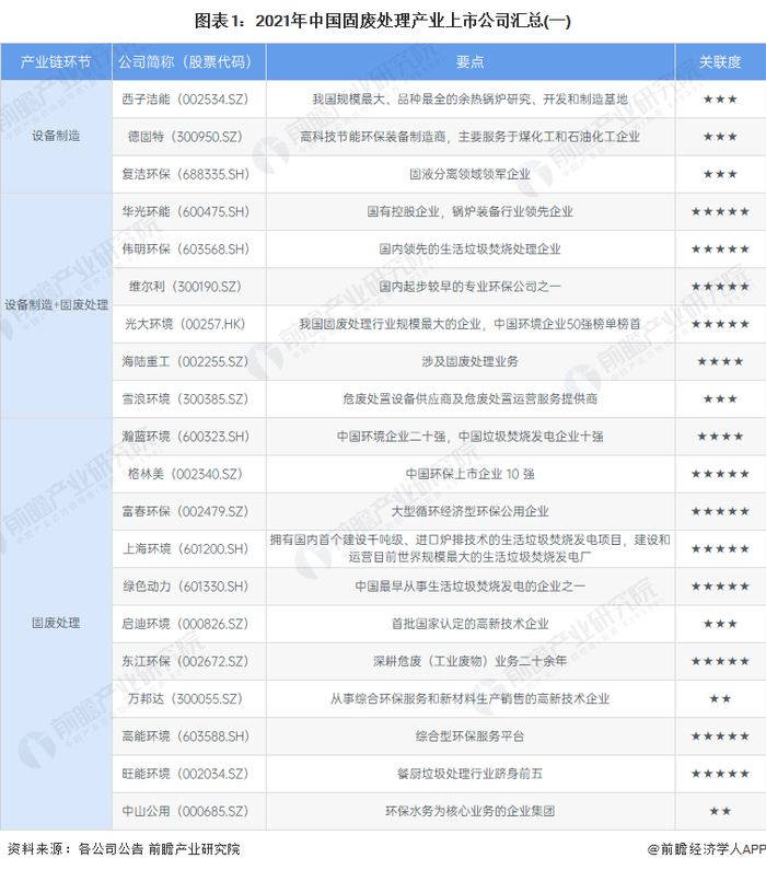 固废处理行业上市公司按产业链参与环节可分为上游设备制造、中游固废处理、下游废弃物回收利用三类,部分企业同时布局上游设备制造及中游固废处理业务。各环节具体上市公司如下: