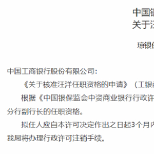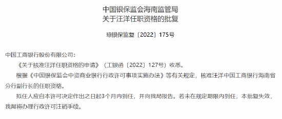 银保监会已核准汪洋任职中国工商银行海南省分行副行长的资格