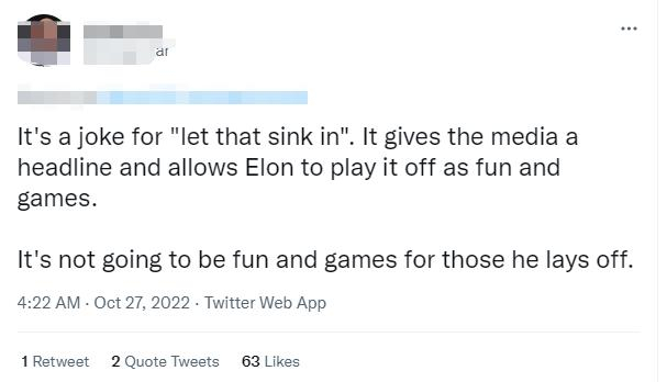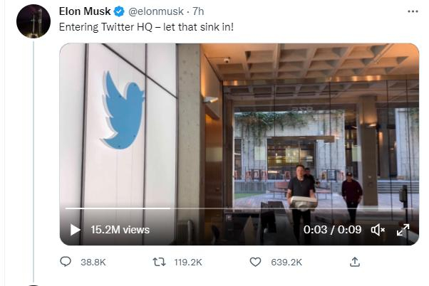 他还在社交媒体上分享了自己走进大楼的视频,并用水槽玩了一个梗,“进入推特总部,你们细品一下!(let that sink in,sink是水槽的意思,这个短语可以被理解为使用者认为其刚刚发布的信息是令人惊讶的,有趣的,或重要的,谈话对象需要花时间去理解其中的含义。)”