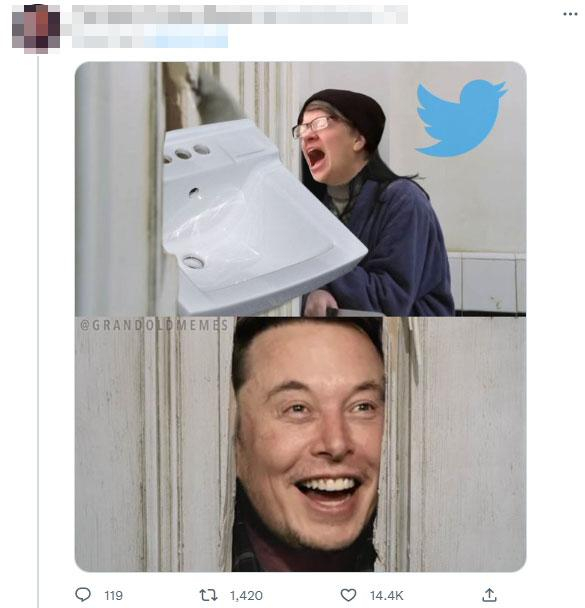 还有《闪灵》中精神病患者杰克·托兰斯拿斧子砍门的经典桥段,变成了马斯克拿水槽砸门,推特员工惊慌失措的恶搞图。
