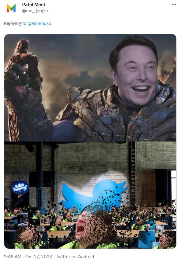 有人则把马斯克P到了电影画面中,讽刺马斯克即将给推特带去的“恐惧”。比如马斯克化身《复仇者联盟》中的灭霸,一个响指就能让一群员工“消失”。