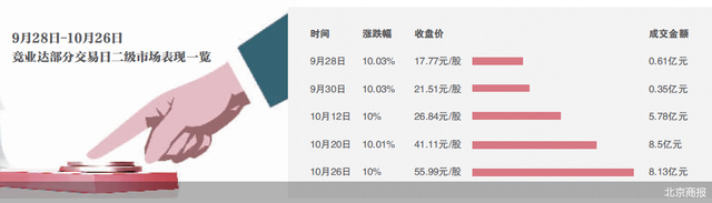 从竞业达二级市场来看,公司近期股价出现猛涨,自9月28日开始启动上涨行情,经统计,在9月28日-10月26日这近16个交易日,公司斩获了10个涨停板,区间累计涨幅高达246.69%,而同期大盘跌幅为3.19%。