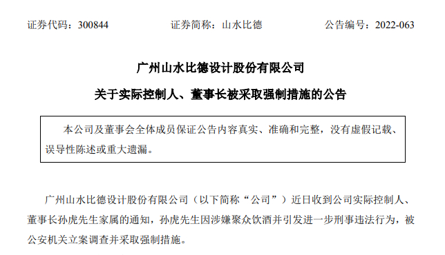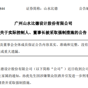 26日的公告显示,山水比德近日收到公司实际控制人、董事长孙虎家属的通知,孙虎因涉嫌聚众饮酒并引发进一步刑事违法行为,被公安机关立案调查并采取强制措施。