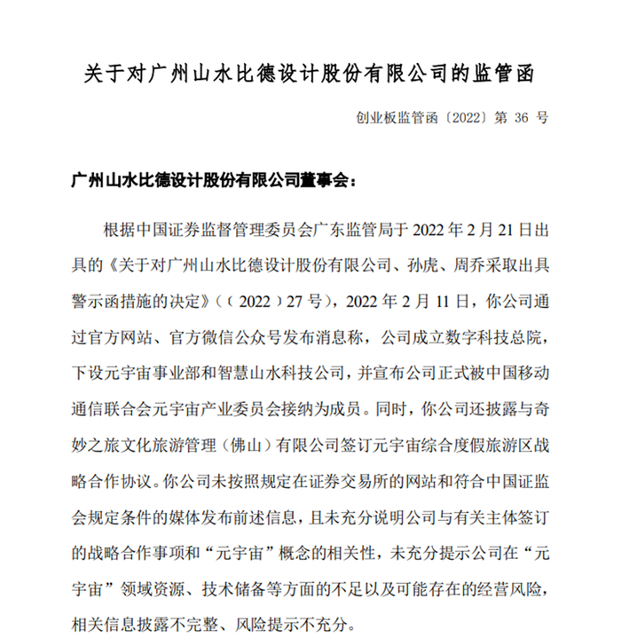 2022年2月24日,山水比德公告,公司于近日收到中国证券监督管理委员会广东监管局出具的《关于对广州山水比德设计股份有限公司、孙虎、周乔采取出具警示函措施的决定》。原因是山水比德于2022年2月11日通过官方网站、官方微信公众号发布消息称,公司成立数字科技总院,下设元宇宙事业部和智慧山水科技公司,并宣布公司正式被中国移动通信联合会元宇宙产业委员会接纳为成员。同时,山水比德还披露与奇妙之旅文化旅游管理(佛山)有限公司签订元宇宙综合度假旅游区战略合作协议。